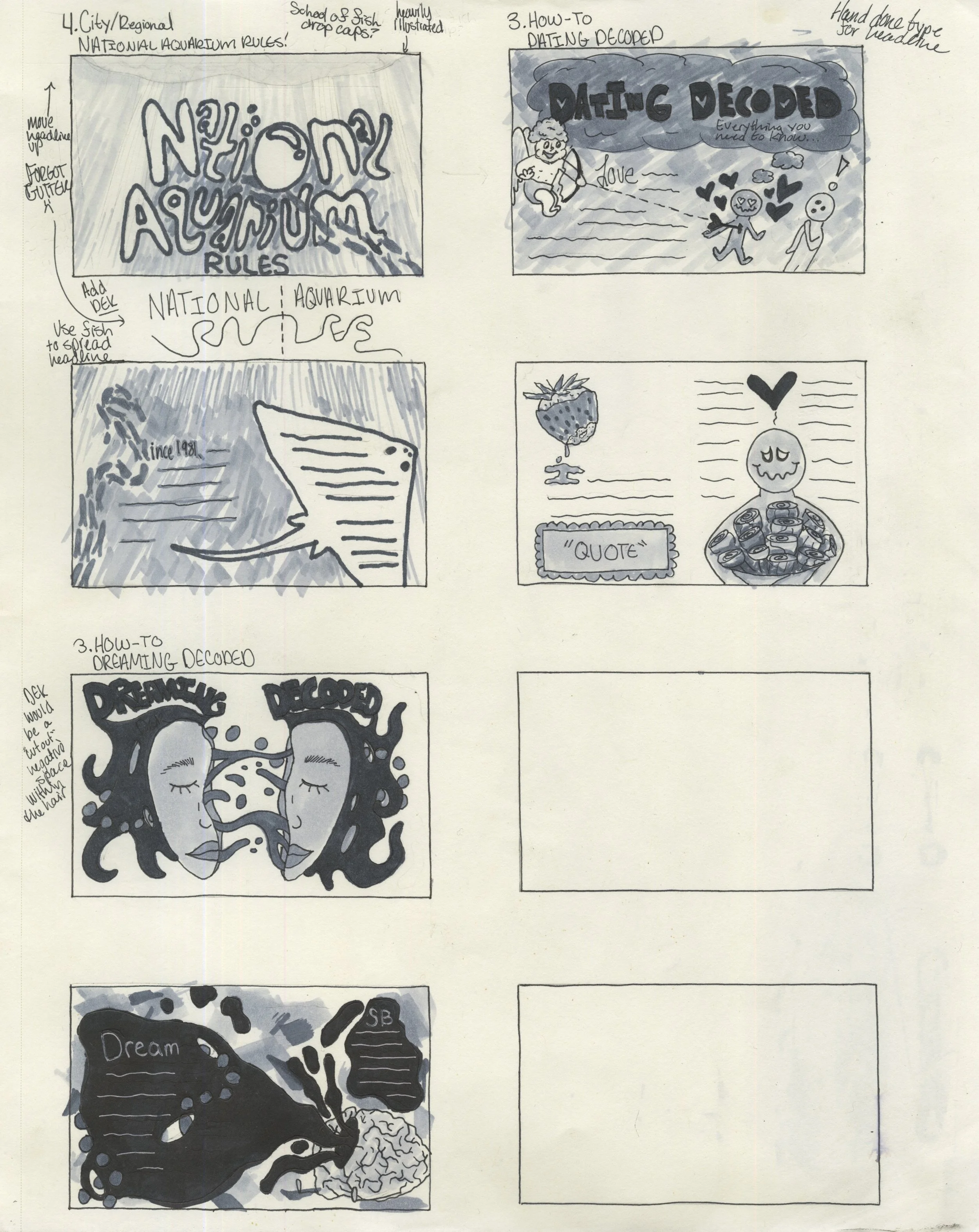 Lucid dreaming is a skill not many possess, but little do people know, you can put in the time to become a pro! The Dreaming Decoded magazine spreads were created to inform people of the many ways that lucid dreaming can be practiced and perfected. Since dreams can be wild, weird, and make little to no sense, digitally illustrating the spreads with dream-like scenes allows people to not only read about the possibilities, but also visualize them. Shades of gray mingle together with pops of color to show that no matter if you dream in color or black and white, they can still be full of amazing subjects.