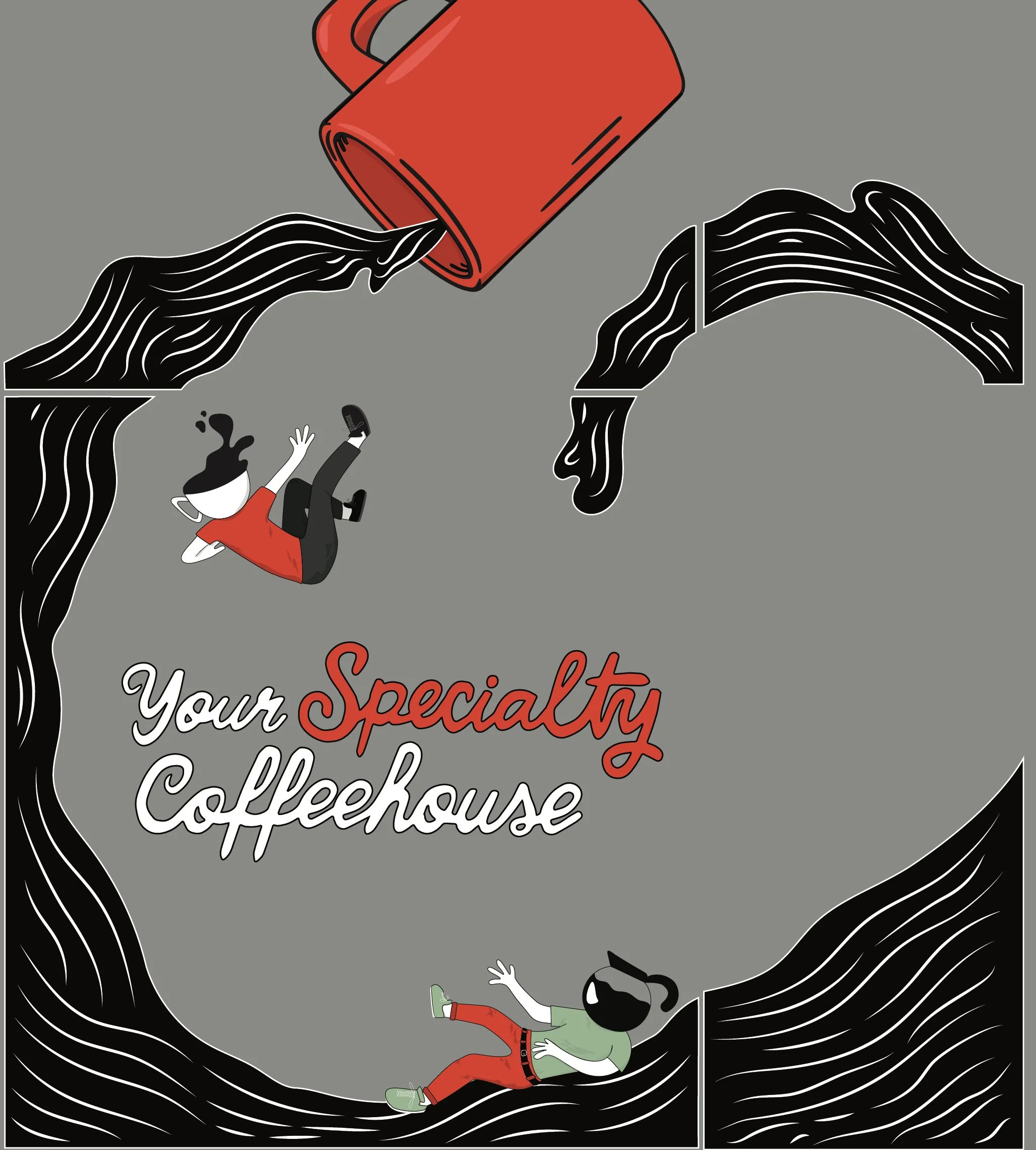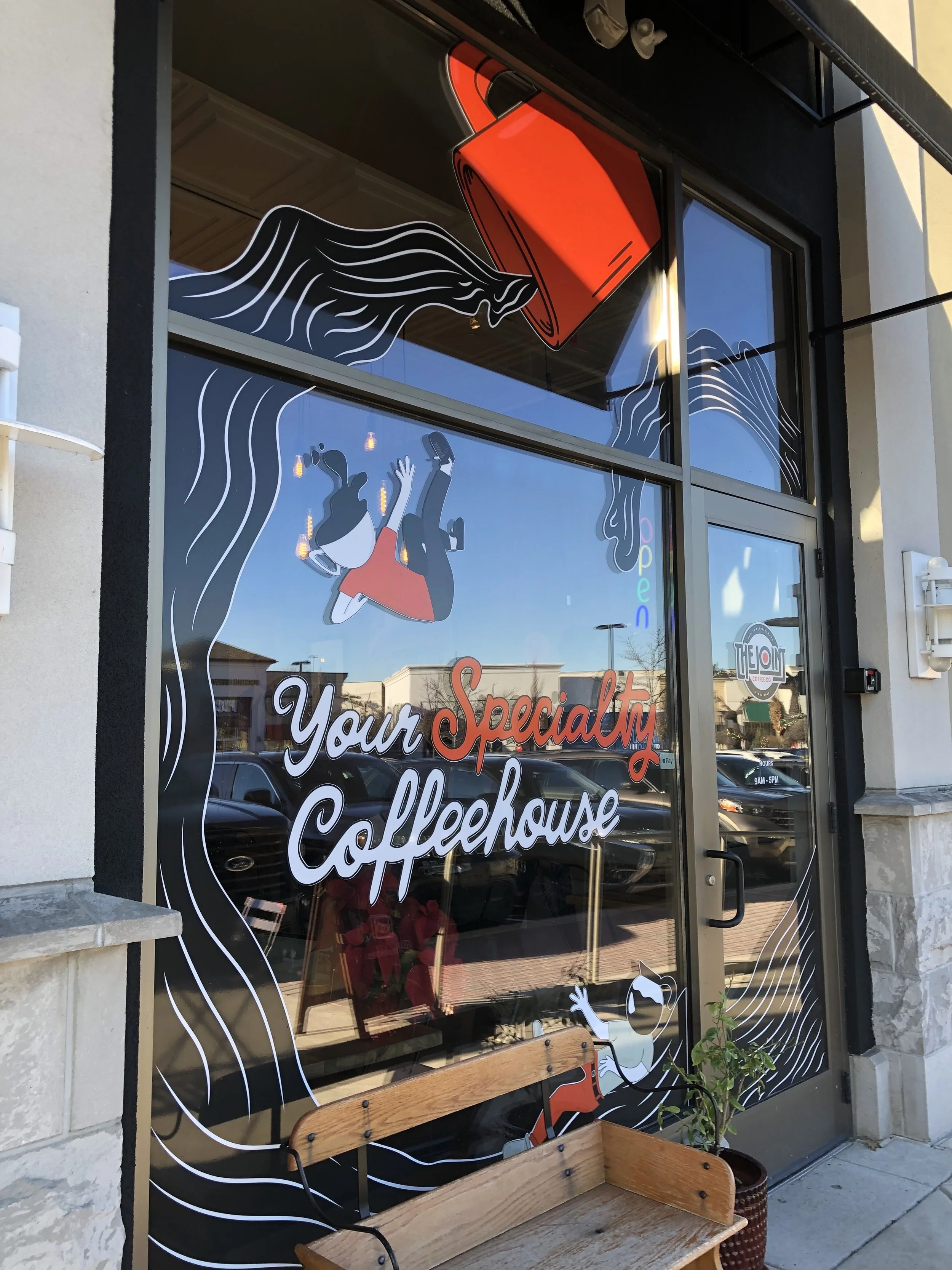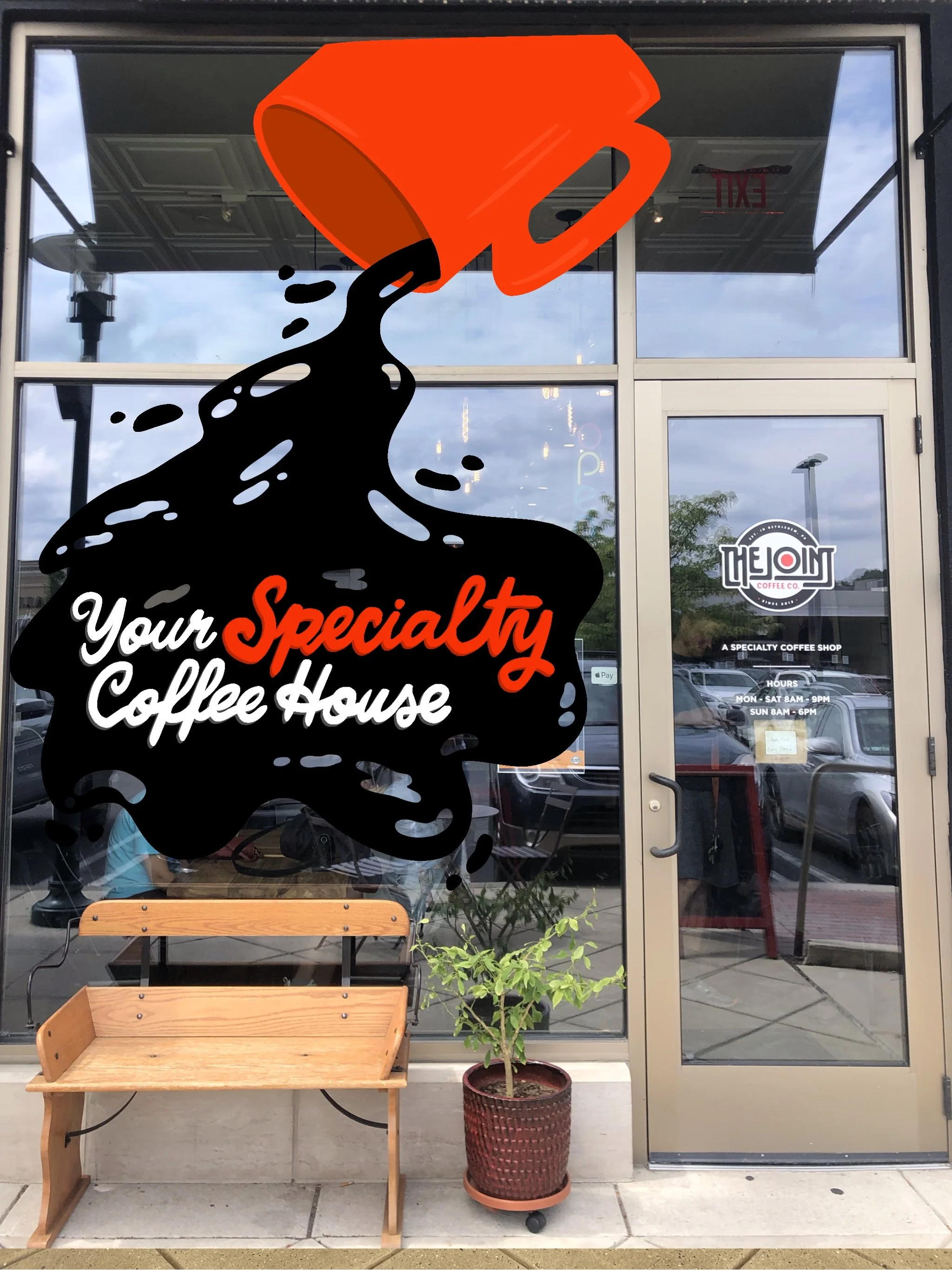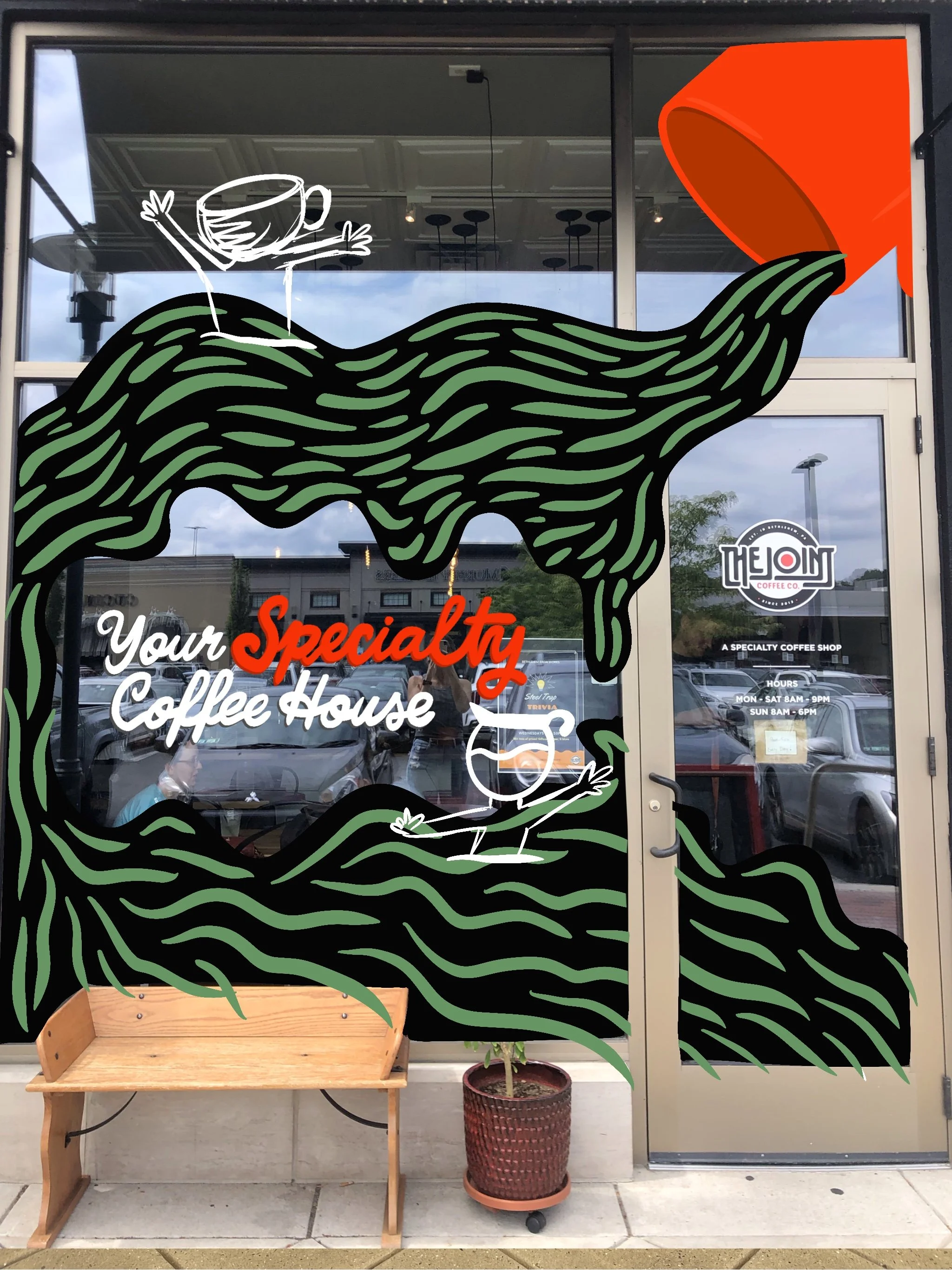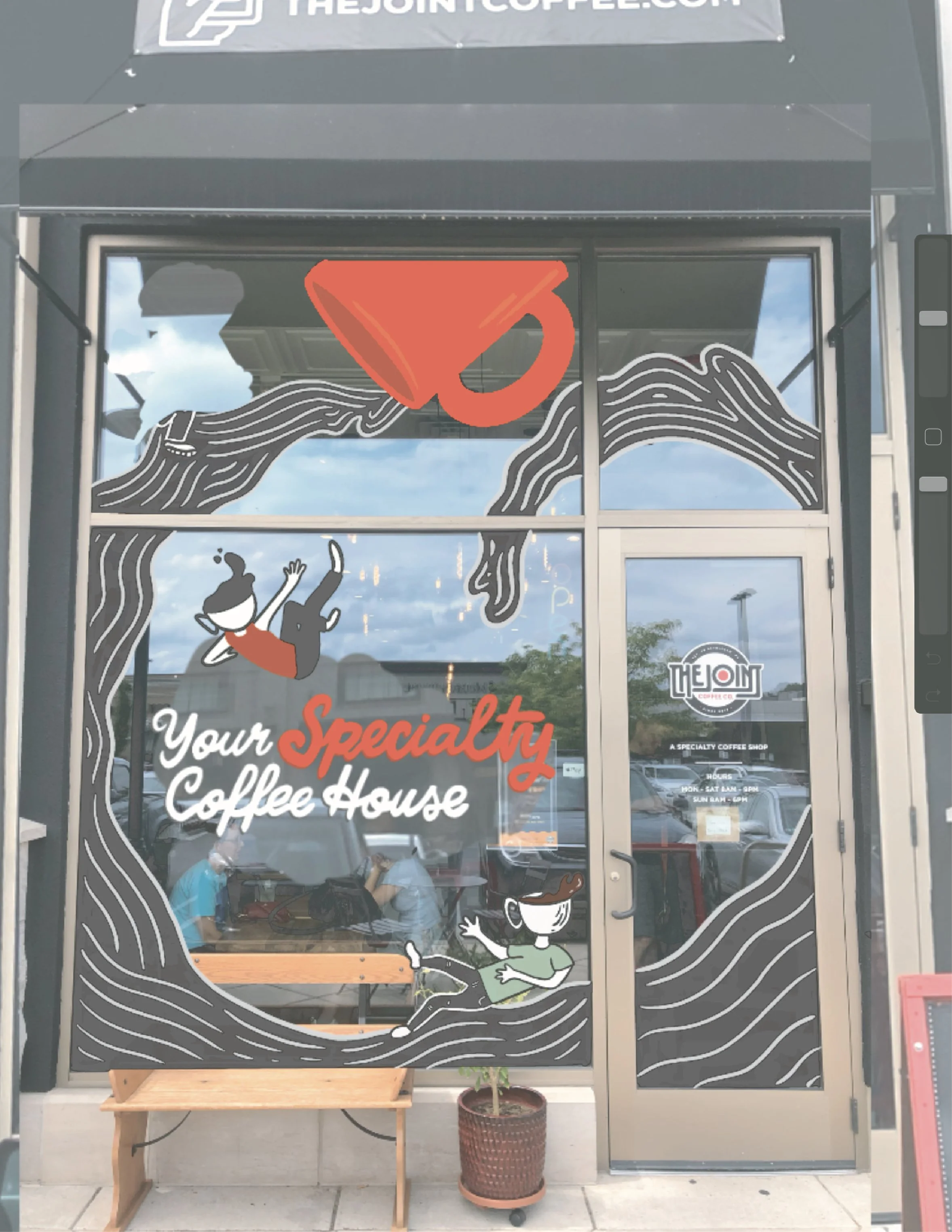 A coffee utopia is a world people could only dream of– until now! Visit The Joint Coffee Co. in Allentown, PA to be whisked away to a world of delightful drinks and thrilling scenery. Meet Mugs and Pothead, the best friend duo that will get you through our day! They’ll take you on a trip through swirls of coffee that showcase a color palette filled with energizing reds, grounding greens, and neutral blacks and grays. Get lost in the atmosphere as we take you on a trip to feel oh-so-good! Window signage was created by Olivia King and myself.